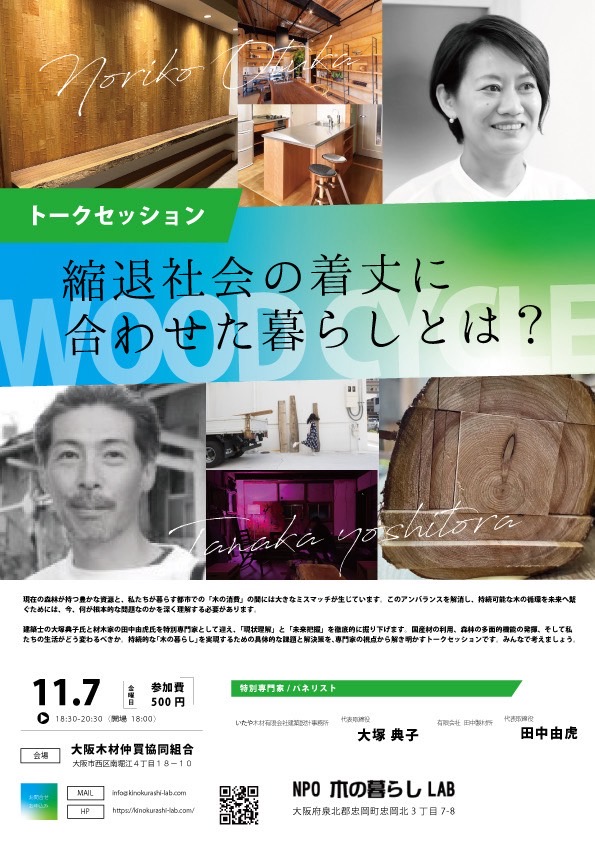 トークセッション開催 2025.11.07 Tweet Share Hatena Pocket RSS feedly Pin it この記事のタイトルとURLをコピーする 2025年11月7日(金) 19:00スタート 大阪木材仲買会館 テーマ 「縮退社会の着丈に合わせた暮らしとは」 パネラー 木の暮らしLAB 理事 田中 由虎 大塚 典子 Tweet Share Hatena Pocket RSS feedly Pin it